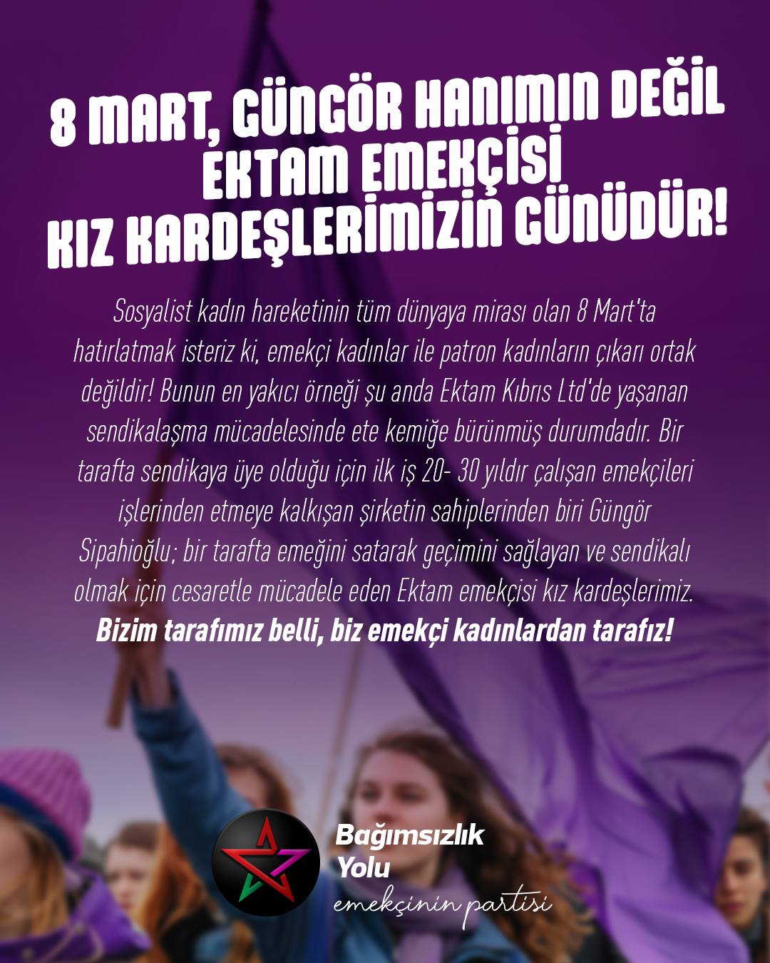 Sosyalist kadın hareketinin tüm dünyaya mirası olan 8 Mart’ta hatırlatmak isteriz ki, emekçi kadınlar ile patron kadınların çıkarı ortak değildir! Bunun en yakıcı örneği şu anda Ektam Kıbrıs Ltd’de yaşanan sendikalaşma mücadelesinde ete kemiğe bürünmüş durumdadır. Bir tarafta sendikaya üye olduğu için ilk iş 20- 30 yıldır çalışan emekçileri işlerinden etmeye kalkışan şirketin sahiplerinden biri Güngör Sipahioğlu; bir tarafta emeğini satarak geçimini sağlayan ve sendikalı olmak için cesaretle mücadele eden Ektam emekçisi kız kardeşlerimiz. Bizim tarafımız belli, biz emekçi kadınlardan tarafız! Ektam emekçisi kız kardeşlerimiz ile Ektam patronlarından Güngör Hanımın çıkarlarının sırf kadın oldukları için ortak olmadığını biliyoruz. Ektam emekçisi kız kardeşlerimizin hak ve özgürlüklerinin birlikte grev yaptığı diğer emekçiler ile patronları Güngör Hanımdan daha fazla ortaklaştığını biliyoruz. Bu yüzden 8 Mart’ın Güngör Hanım’ın değil Ektam emekçisi kız kardeşlerimizin günü olduğunu da hatırlatmak istiyoruz!