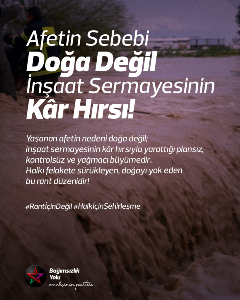 İnşaat ve emlak sermayesi iş cinayetleri, kara para aklama rejimi, kontrolsüz nüfus politikaları, köle işgücü arzusu, tarım ve hayvancılığı yok eden aç gözlülüğü, gençleri evsiz bırakan kâr hırsı ve Kıbrıs sorununda yarattığı çıkmaz ile yetinmemiş; yarattığı çarpık kentleşme sonucu ülkemizi yaşanmaz hale getirmiştir. Bu talan düzeninin çanta taşıyıcılığına soyunan gelmiş geçmiş hükümetler ise, aynı “benden sonrası tufan” zihniyetiyle hareket ederek su toplama politikaları geliştirmekten, altyapı yatırımı ve bakımından yıllarca kaçınmış; böylece doğaya bereket getirecek yağmurun felakete dönüşmesinde pay sahibi olmuştur.