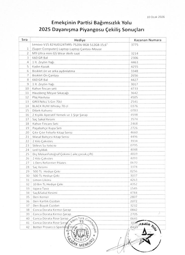 Bağımsızlık Yolu’nun “Emekçinin Piyangosu” olarak da bilinen dayanışma piyango çekilişi 10 Ocak 2026 tarihinde noter huzurunda gerçekleştirildi.