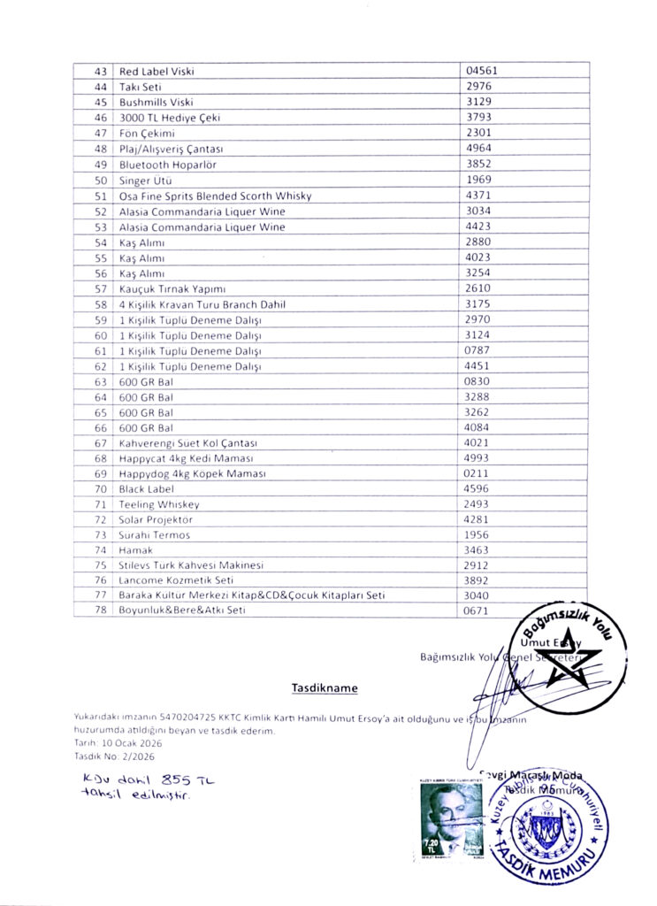 Bağımsızlık Yolu Parti Merkezi’nde noter huzurunda gerçekleşen çekilişte parti üyeleri ve dostlarının bağışladıkları emek yoğun ürünlerden oluşan 78 hediyenin kazanan numaraları belirlendi. Büyük ikramiye “Lenovo V15 82YU0124TXR5” Laptop ve Aksesuarları “3775” numaralı Lefkoşa’da satışı gerçekleşen bilete isabet etti.