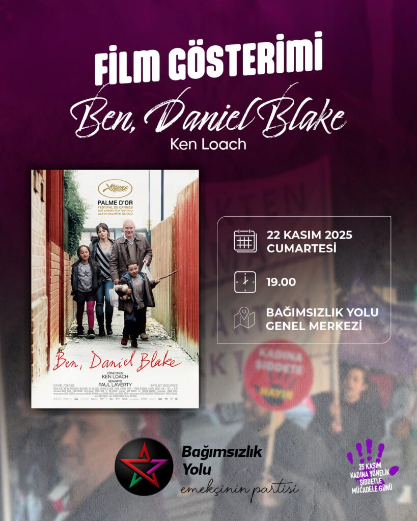 Partiden yapılan açıklamaya göre, etkinlik 22 Kasım 2025 Cumartesi günü saat 19.00’da Bağımsızlık Yolu Genel Merkezi’nde gerçekleştirilecek. Program kapsamında, yönetmenliğini Ken Loach’un üstlendiği “Ben, Daniel Blake” filmi izleyiciyle buluştuktan sonra söyleşi de gerçekleştirilecek.