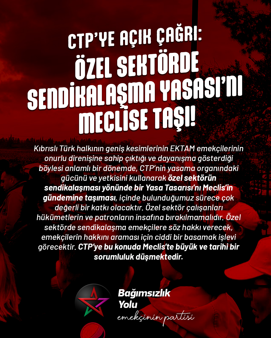 Bu doğrultuda, Bağımsızlık Yolu olarak CTP’ye açık bir çağrıda bulunarak, CTP’nin Özel Sektörde Sendikalaşma Yasası’nı Meclis’e taşımasını dile getirmek istiyoruz. CTP, EKTAM emekçilerinin direnişine halihazırda destek olmaktadır. Biz bu desteği selamlıyoruz ve CTP’nin EKTAM’daki emek mücadelesine gösterdiği desteğin değerli olduğunu düşünüyoruz. Bununla birlikte, CTP’nin Meclis’teki varlığını kullanarak bu direnişe daha da anlamlı ve değerli bir katkı yapma şansına sahip olduğu da ortadadır. EKTAM patronlarının zorbaca bir tavırla emekçilerin haklı talebine sırt çevirdiği böylesi bir dönemde, CTP’nin Özel Sektörde Sendikalaşma Yasası’nı Meclis’e taşıması EKTAM’daki direnişe anlamlı ve ciddi bir katkı sağlayacaktır. Elbette bu Yasa’nın Meclis’ten geçmesi için CTP milletvekillerinin sayısı yeterli değildir. Ancak bu Yasa’nın böylesi kritik bir dönemde Meclis gündemine gelmesi, hem EKTAM’ın patronları üzerindeki baskıyı artıracak hem de ülkedeki tüm özel sektör emekçilerinin sendikalaşma arzusuna bir umut ışığı olacaktır.