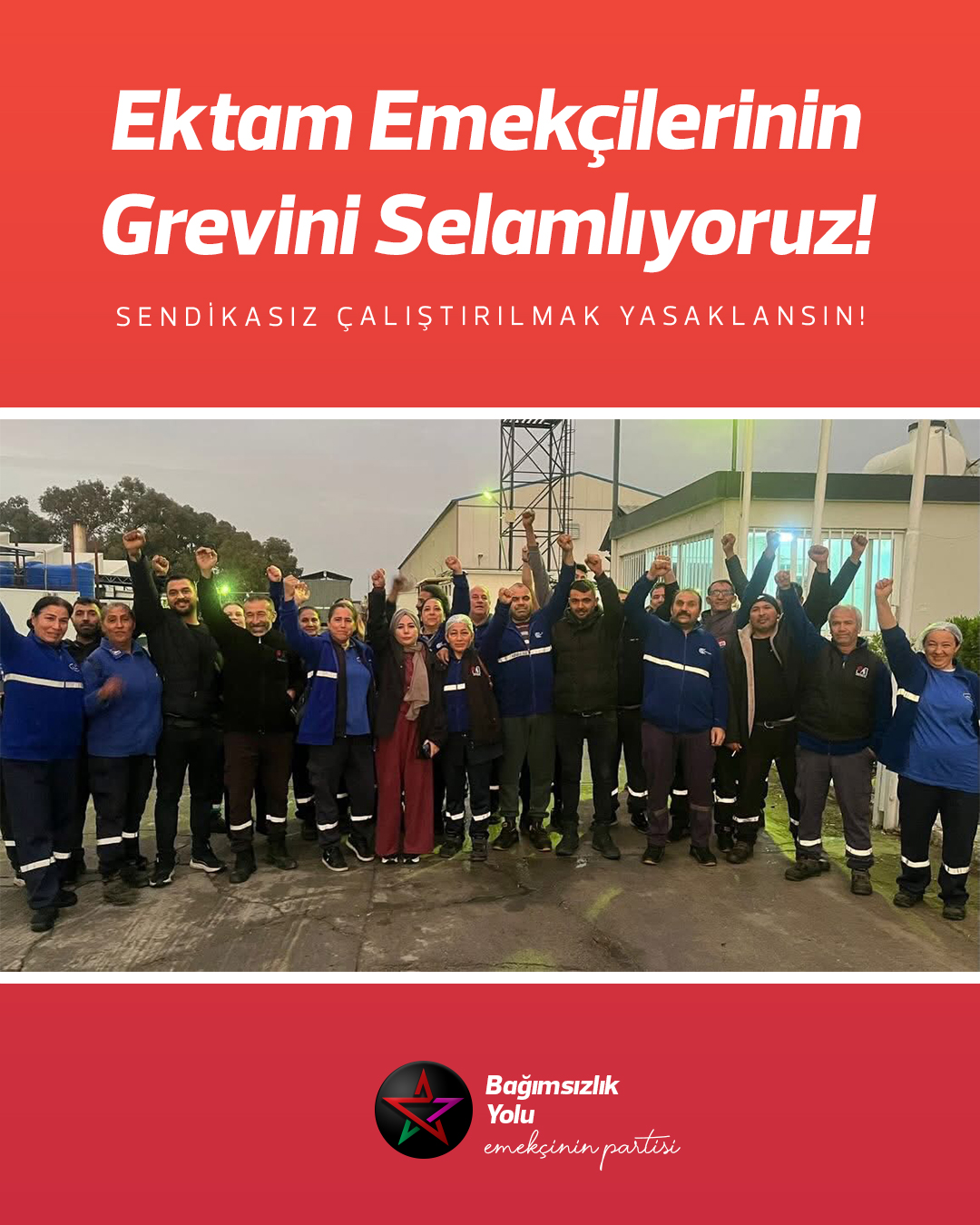 Emekçinin Partisi Bağımsızlık Yolu olarak, Dev-İş’e bağlı Emek-İş’in örgütlülüğünde Ektam Kıbrıs’ta sendikal hakları için greve çıkan işçilerin yanında olduğumuzu açıkça ilan ediyoruz.