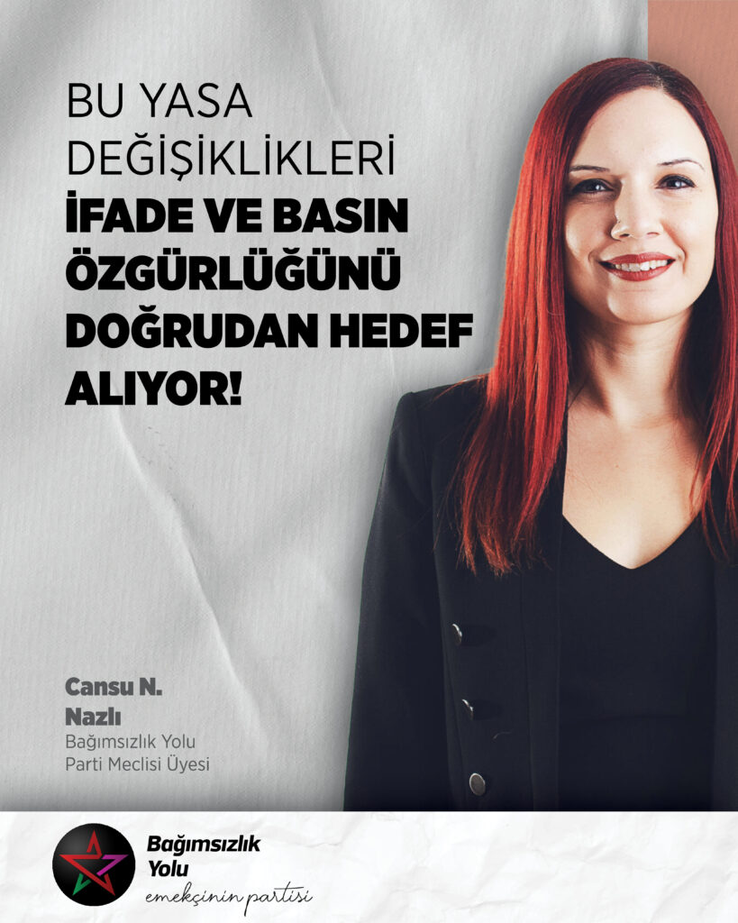 Bağımsızlık Yolu Parti Meclis Üyesi Cansu N. Nazlı, hükümetin gündeme getirdiği Ceza Yasası ve Bilişim Suçları Yasası değişikliklerine ilişkin yaptığı açıklamada, söz konusu düzenlemelerin hem yasa yapım tekniği açısından hatalı olduğunu hem de ifade ve basın özgürlüğünü ciddi biçimde tehdit ettiğini vurguladı.
