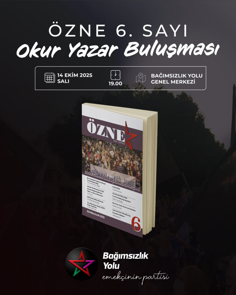 Bağımsızlık Yolu tarafından yapılan açıklamada Özne 6. Sayısı okur yazar buluşması 14 Ekim 2025 Salı günü, saat 19:00’da Bağımsızlık Yolu Parti Genel Merkezi’nde gerçekleşecek.