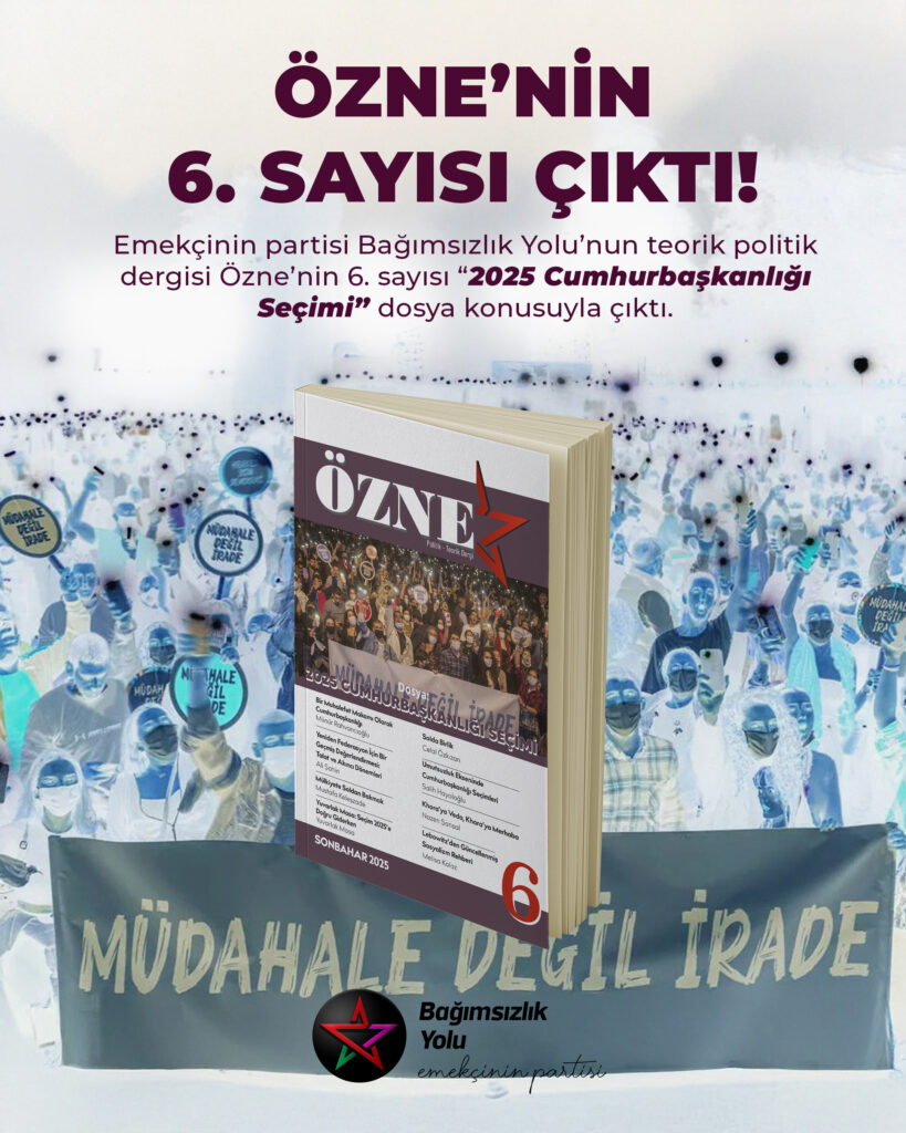 Emekçinin partisi Bağımsızlık Yolu’nun politik-teorik dergisi Özne’nin 6. sayısı çıktı. Bu sayıda, “2025 Cumhurbaşkanlığı Seçimleri” dosya konusu olarak ele alınıyor. Kısır tartışmaların ve yüzeysel atışmaların öne çıktığı seçim sürecine karşı, Özne 6. sayısında derinlikli ve kapsamlı bir bakış açısı sunmayı hedefliyor. Dosya kapsamında yalnızca yaklaşan seçimler değil; dünü, bugünü ve geleceğiyle birlikte cumhurbaşkanlığı makamı ve bu makam etrafında şekillenen konular farklı açılardan inceleniyor.