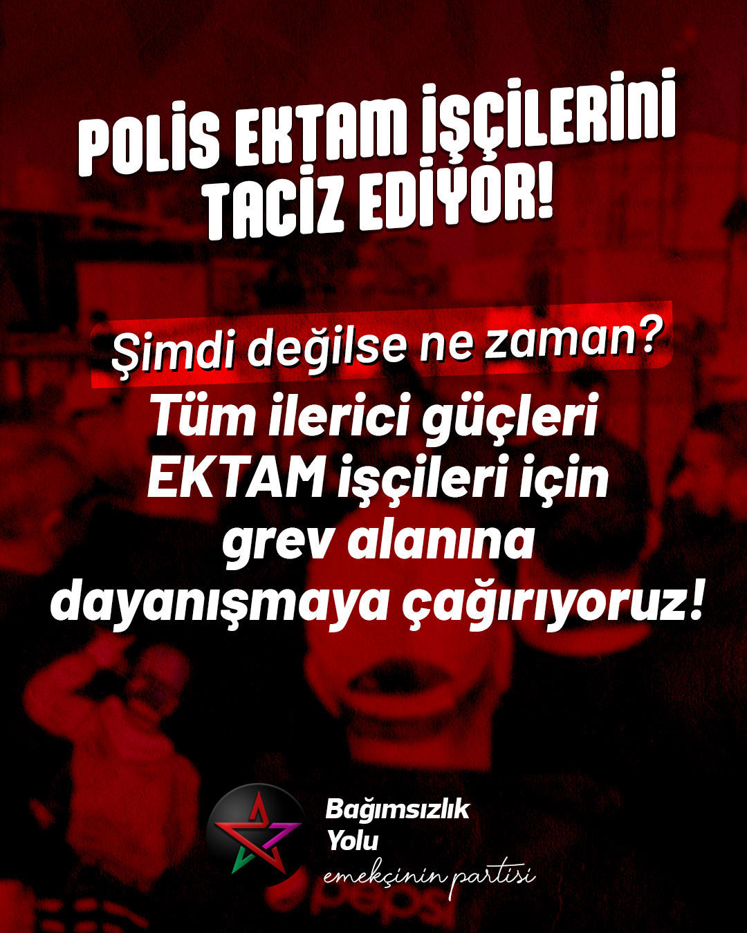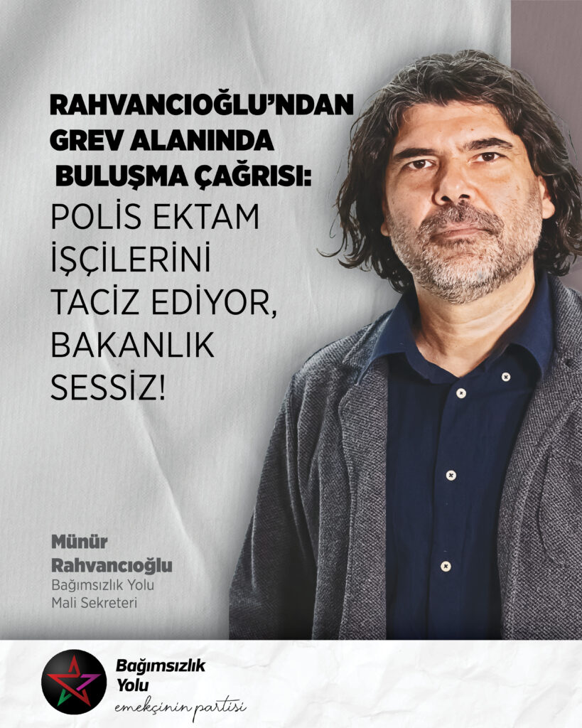 Bağımsızlık Yolu Mali Sekreteri Münür Rahvancıoğlu, EKTAM’da grev yapan işçilere ilişkin açıklama yaptı. Polisin grev alanındaki işçileri taciz ettiğini söyleyerek, kendisini emekten yana, sol ve demokrasi yanlısı olarak tanımlayan herkese çağrıda bulunan Rahvancıoğlu, EKTAM emekçilerinin yanında olunması gerektiğini vurguladı.